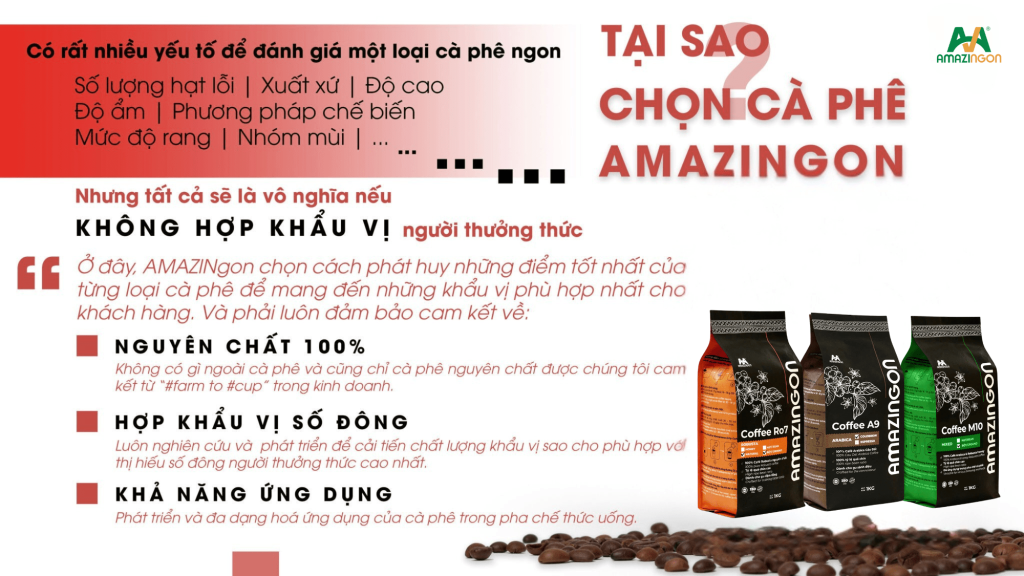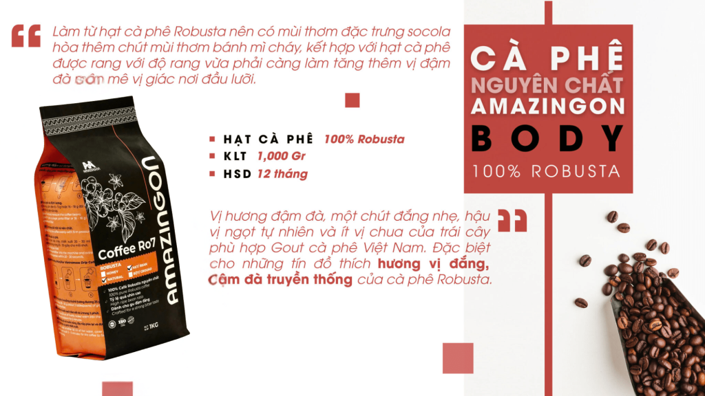 Cà phê nguyên chất AMAZINgon Body (100% Robusta) có vị hương đậm đà, một chút đắng nhẹ, hậu vị ngọt tự nhiên và ít vị chua của trái cây phù hợp Gout cà phê Việt Nam. Đặc biệt cho những tín đồ thích hương vị đắng, đậm đà truyền thống của cà phê Robusta.
