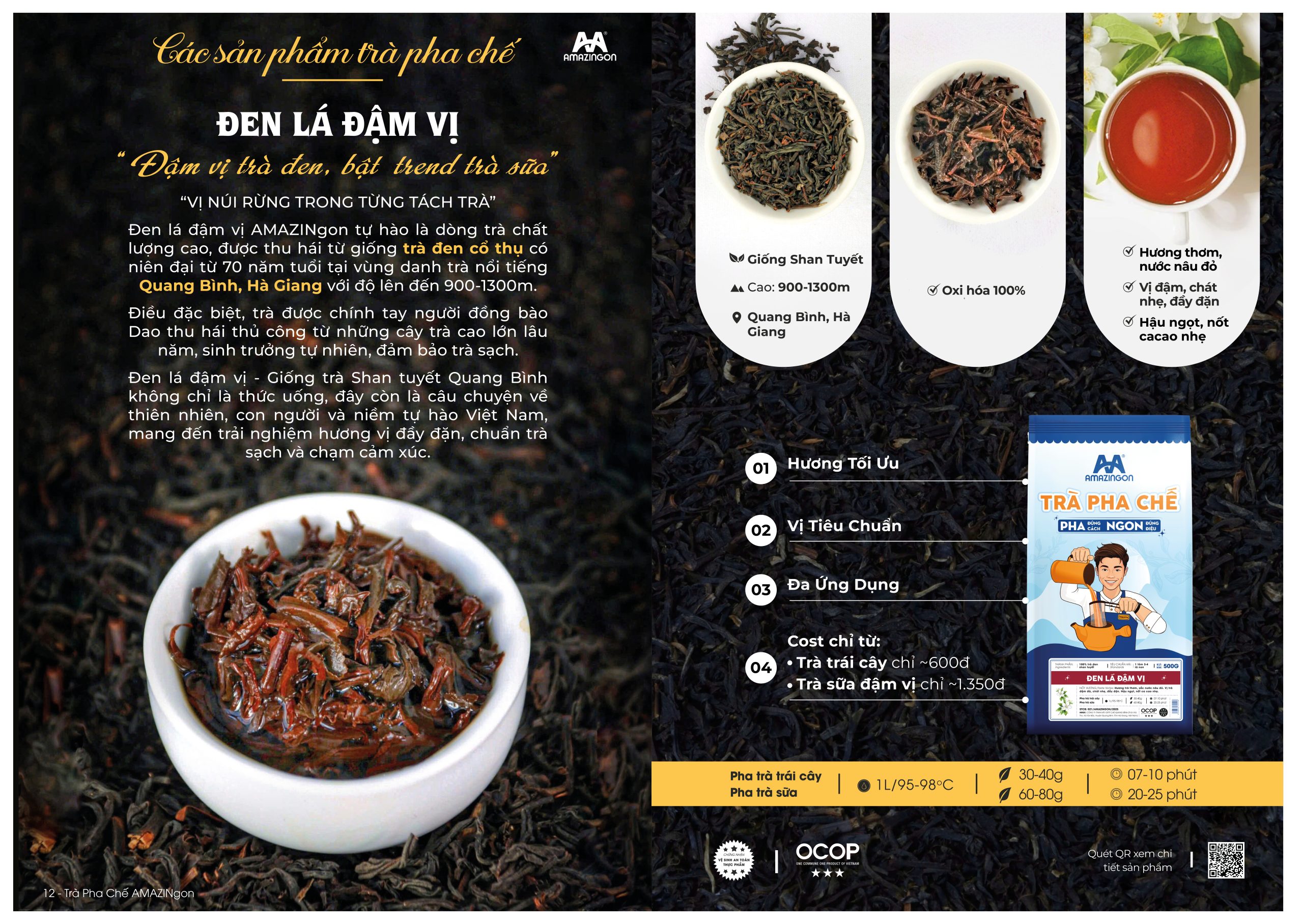 Đen lá đậm vị AMAZINgon (trà đen nguyên vị/trà đen nguyên lá) tự hào là dòng trà chất lượng cao, được thu hái từ giống trà đen cổ thụ có niên đại từ 70 năm tuổi tại vùng danh trà nổi tiếng Quang Bình, Hà Giang với độ lên đến 900-1300m.