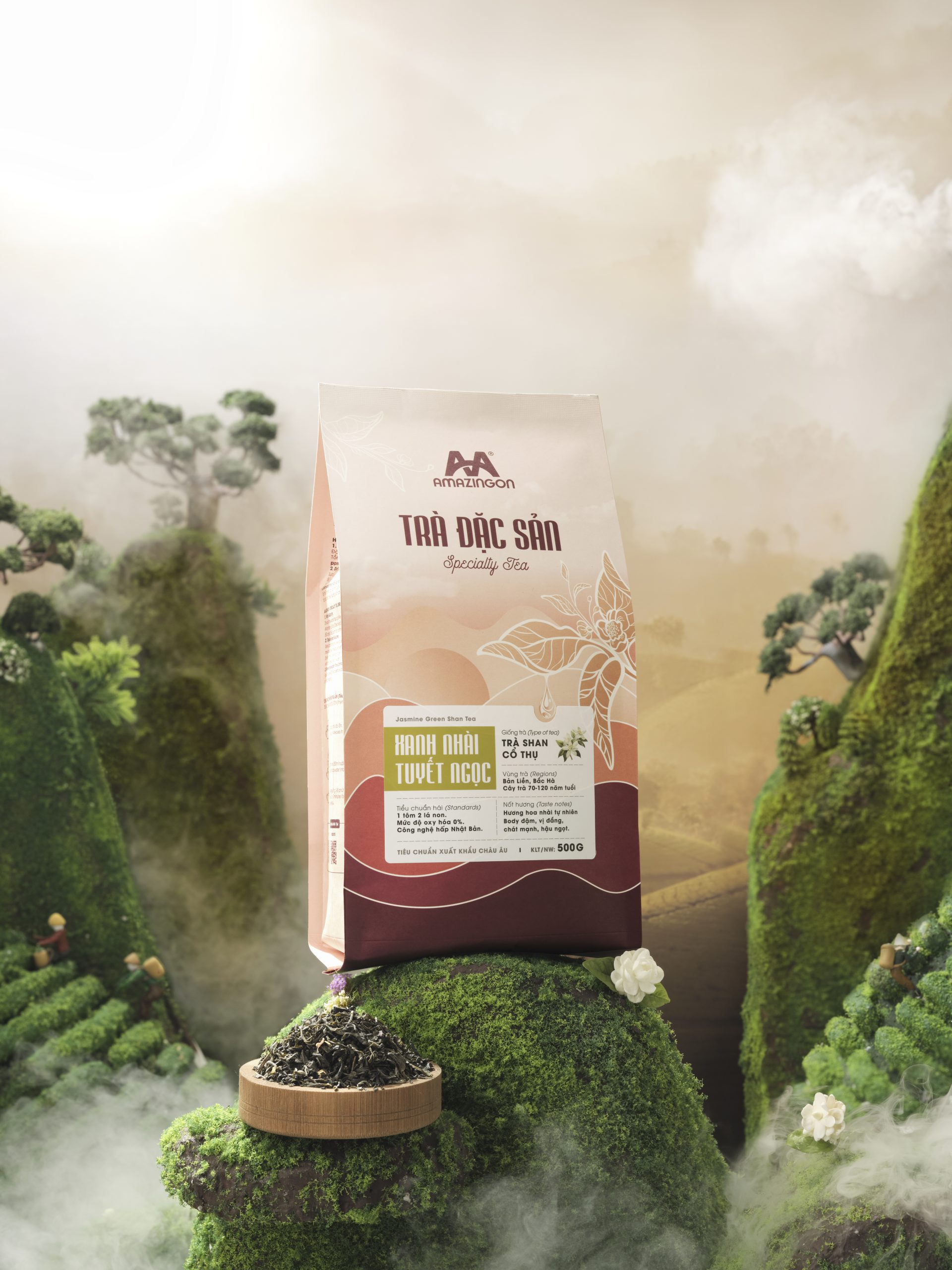 Trà Xanh Nhài Tuyết Ngọc là dòng trà đặc sản được tạo nên từ búp Shan Tuyết hữu cơ Bản Liền – 70 đến 120 năm tuổi – kết hợp cùng hoa nhài tươi ướp đêm theo phương pháp thủ công truyền thống. Sự giao hòa ấy mang đến sắc nước xanh ngà trong vắt, hương nhài thanh khiết và hậu vị ngọt dài, khó quên.