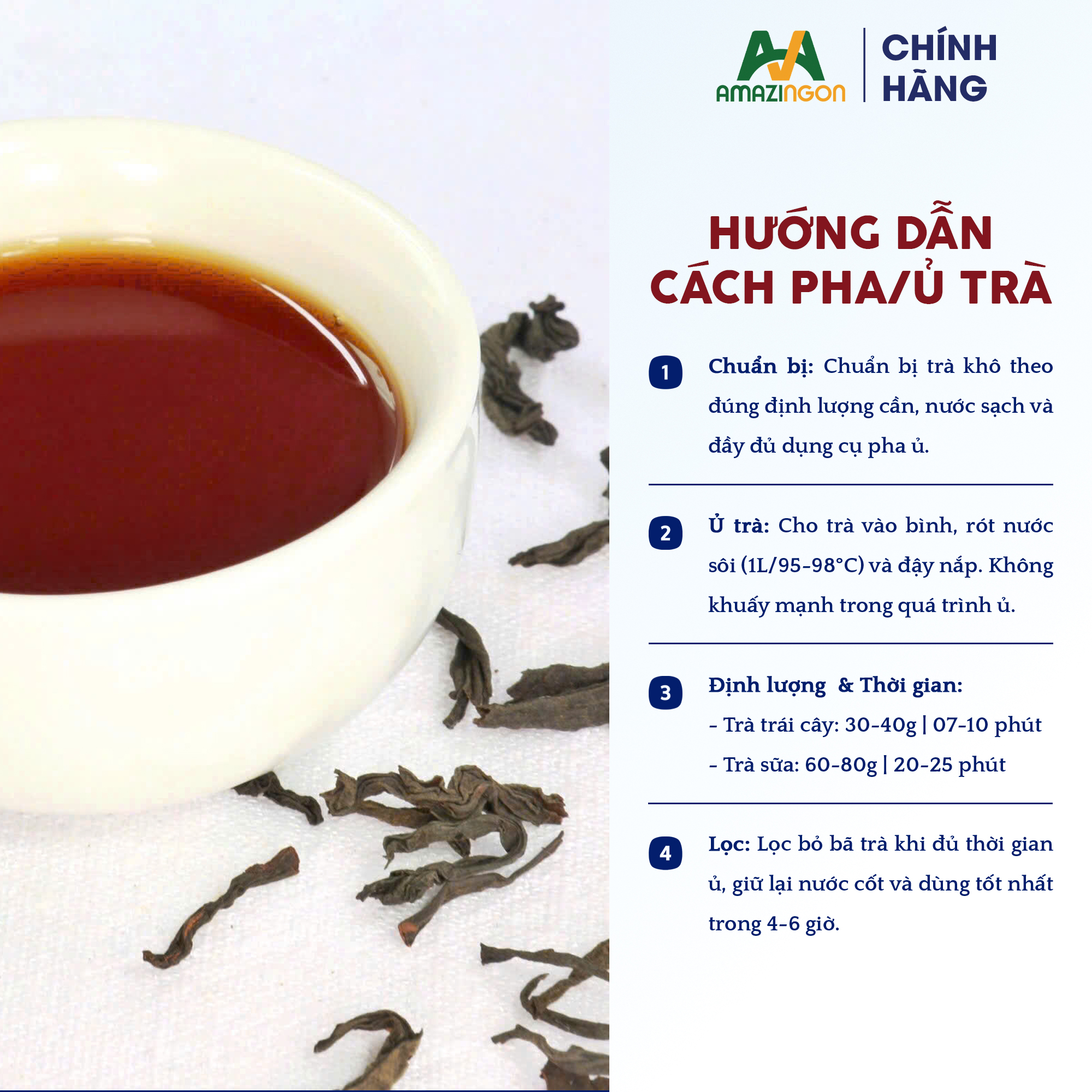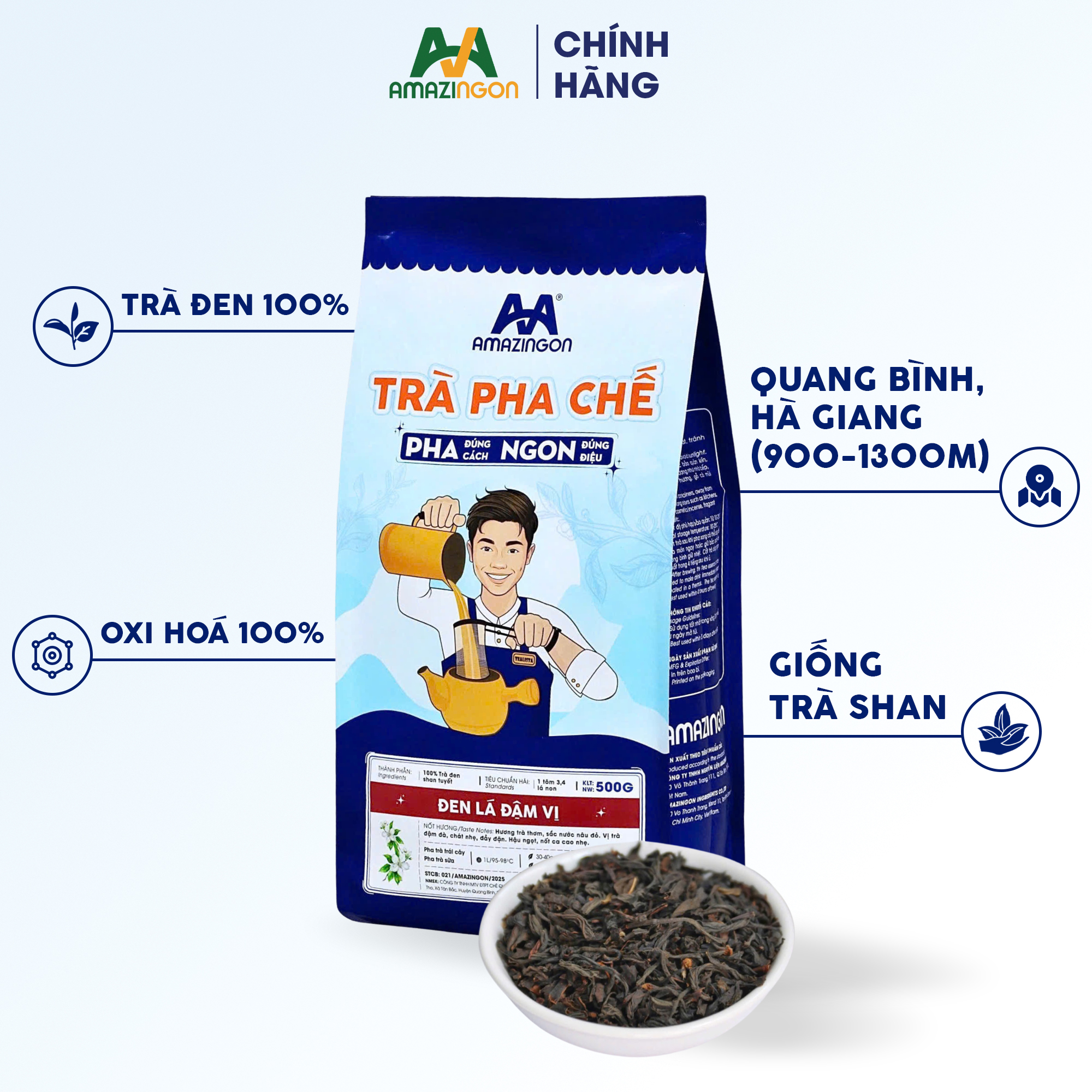 Trà đen AMAZINgon được tuyển chọn từ giống trà Shan, canh tác theo phương pháp hữu cơ làm nguyên liệu sản xuất trà. Những búp trà sau thu hoạch được sơ chế mộc 100%, đảm bảo không tẩm ướp hương liệu hay hoá chất gây hại cho sức khoẻ người dùng.