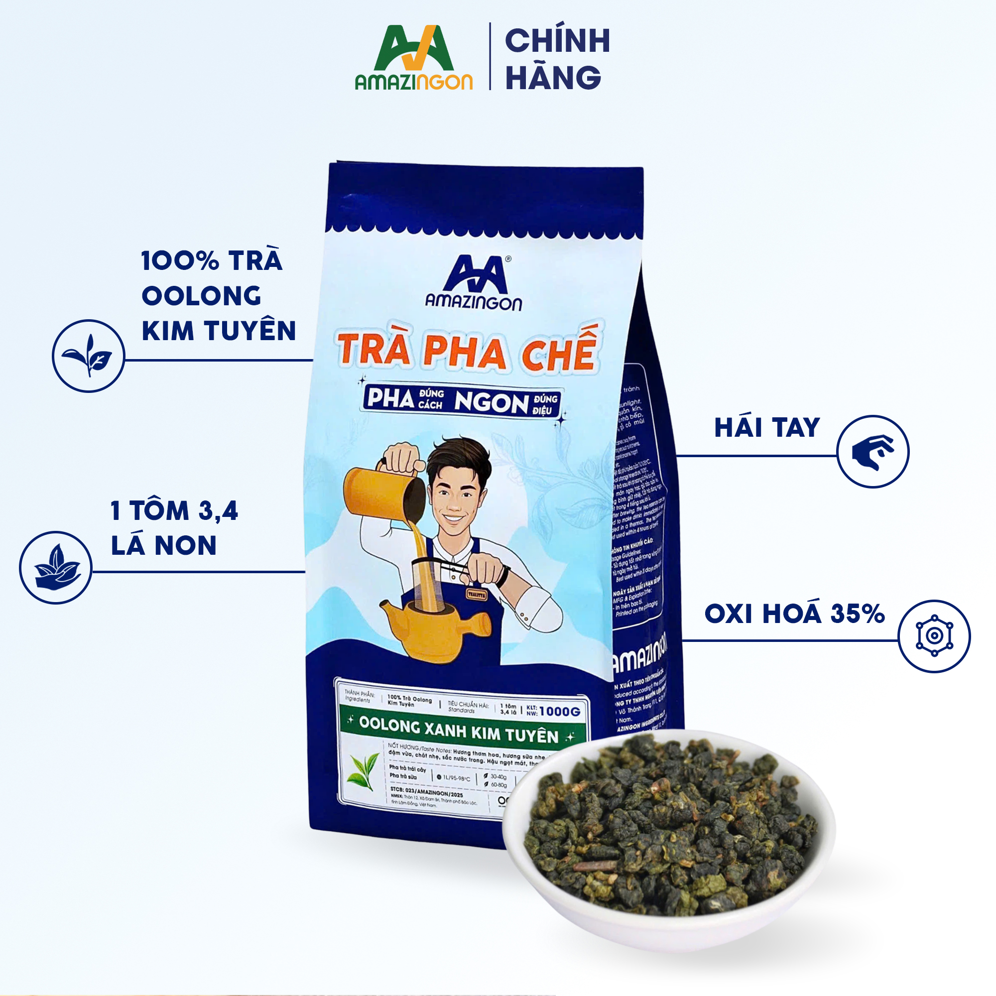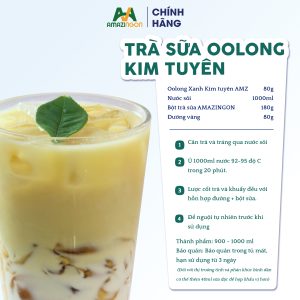 Để đảm bảo dễ sử dụng và vận chuyển cho mục đích làm nguyên liệu trong ngành F&B nói chung và đặc biệt là nguyên liệu pha chế đồ uống nói riêng, sản phẩm Trà Oolong xanh Kim Tuyên AMAZINgon được đóng gói trong túi MATOPP20/MPET20/LLDPE100 đã được kiểm định để đảm bảo an toàn thực phẩm. Thông tin sản phẩm trà Oolong xanh Kim Tuyên AMAZINgon như sau: